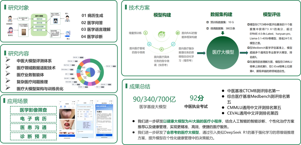 中医基准 CTCMB 测评排名第一,通过中医执业考试 (92分)。引入类 DeepSeek R1 的强化学习思维链推理,构建“会思考的医疗大模型”,赋能个性化健康管理与诊断。